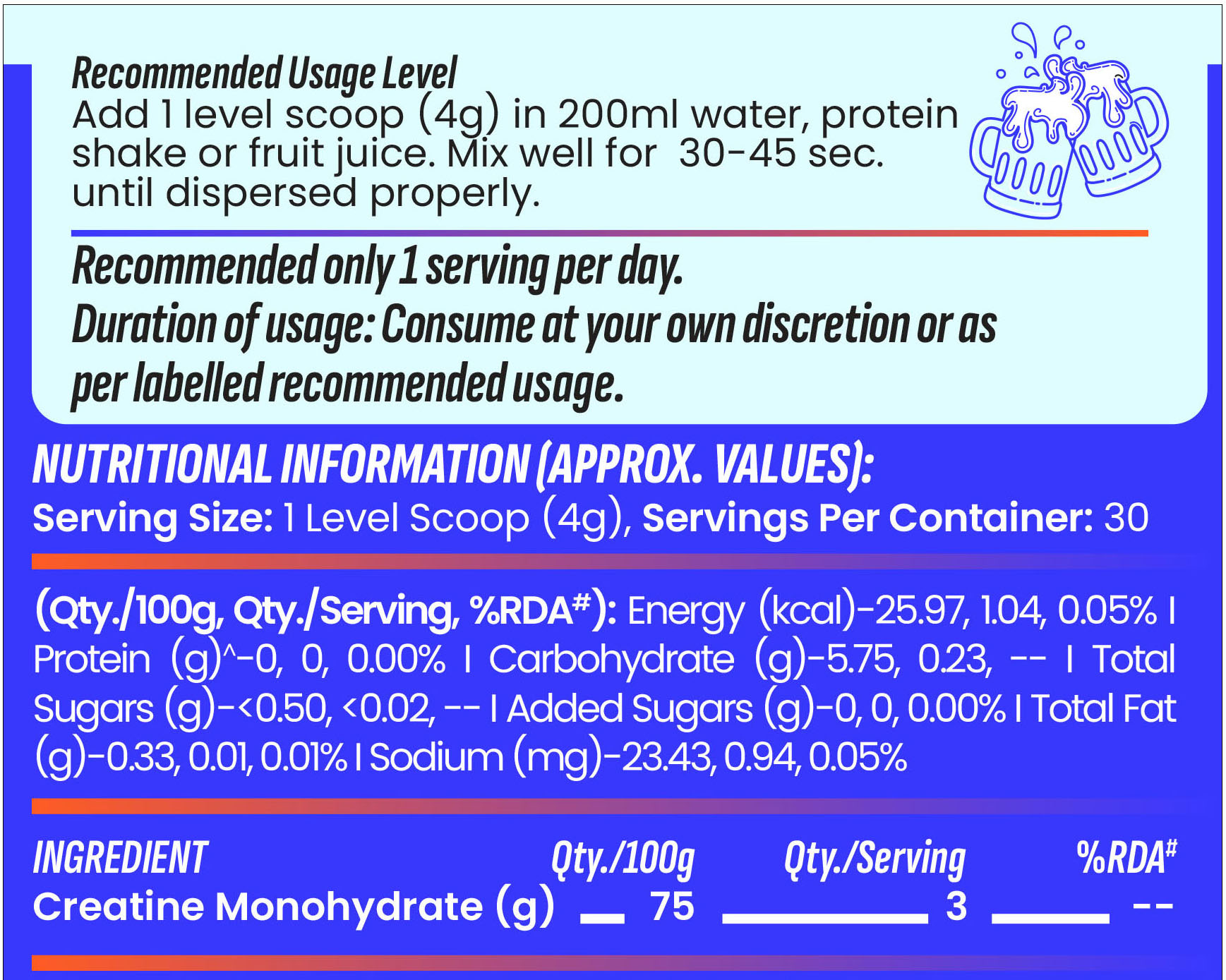 • Strength & Power Boost - 3g of pure creatine monohydrate enhances muscle strength and explosive power for intense workouts.