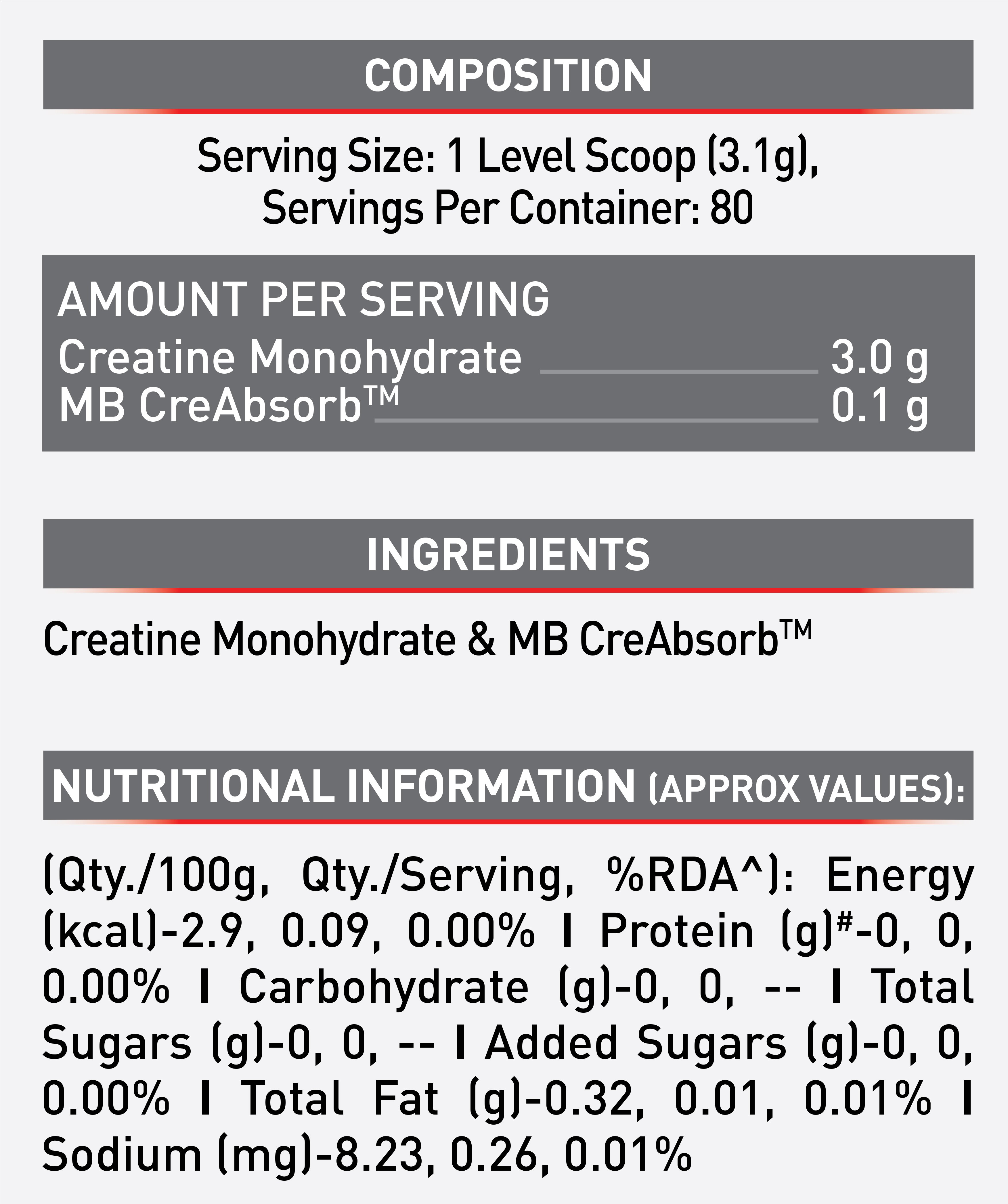 - Unique Inhouse Developed Blend: CreAMPâ„¢ Creatine Monohydrate is powered by MB CreAbsorbâ„¢ which ensures higher bioavailability of Creatine Monohydrate in the body