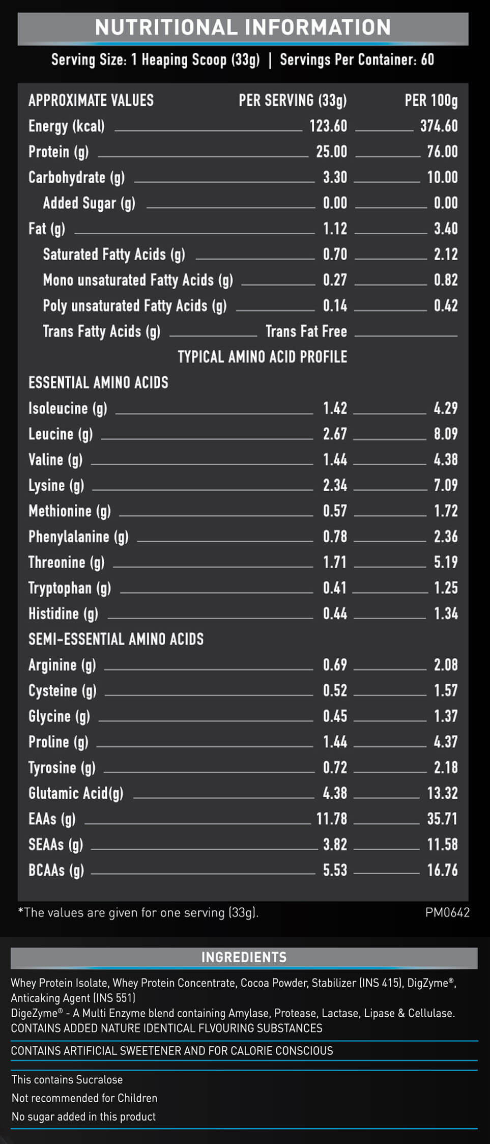 Suggested Servings: Add 1 serving (33g) to 180-240ml of cold water or skimmed milk. Blend for 45-60 seconds for a thick and creamy shake. Take 1-2 protein shakes per day or as directed by your nutritionist.