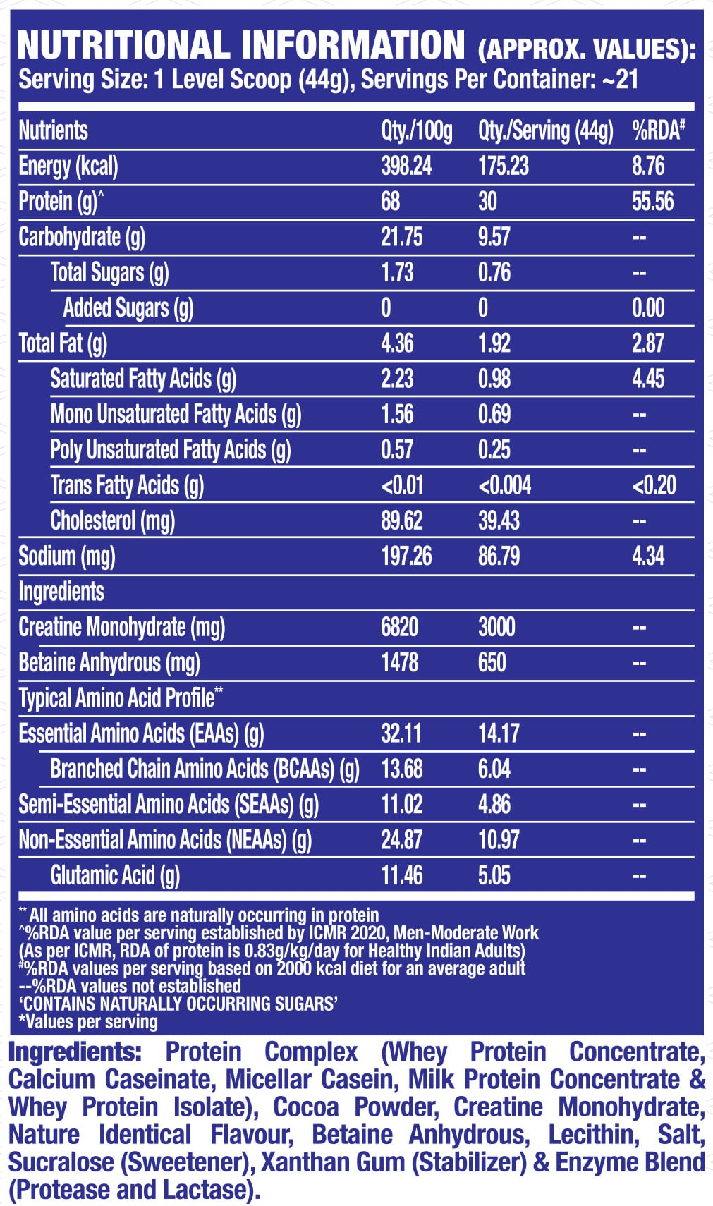 Protein Complex (30g) - A blend of fast and slow-digesting proteins (WPC, Calcium Caseinate, Micellar Casein, Milk Protein Concentrate & WPI) designed for sustained amino acid release. Supports muscle growth, recovery, and satiety throughout the day.