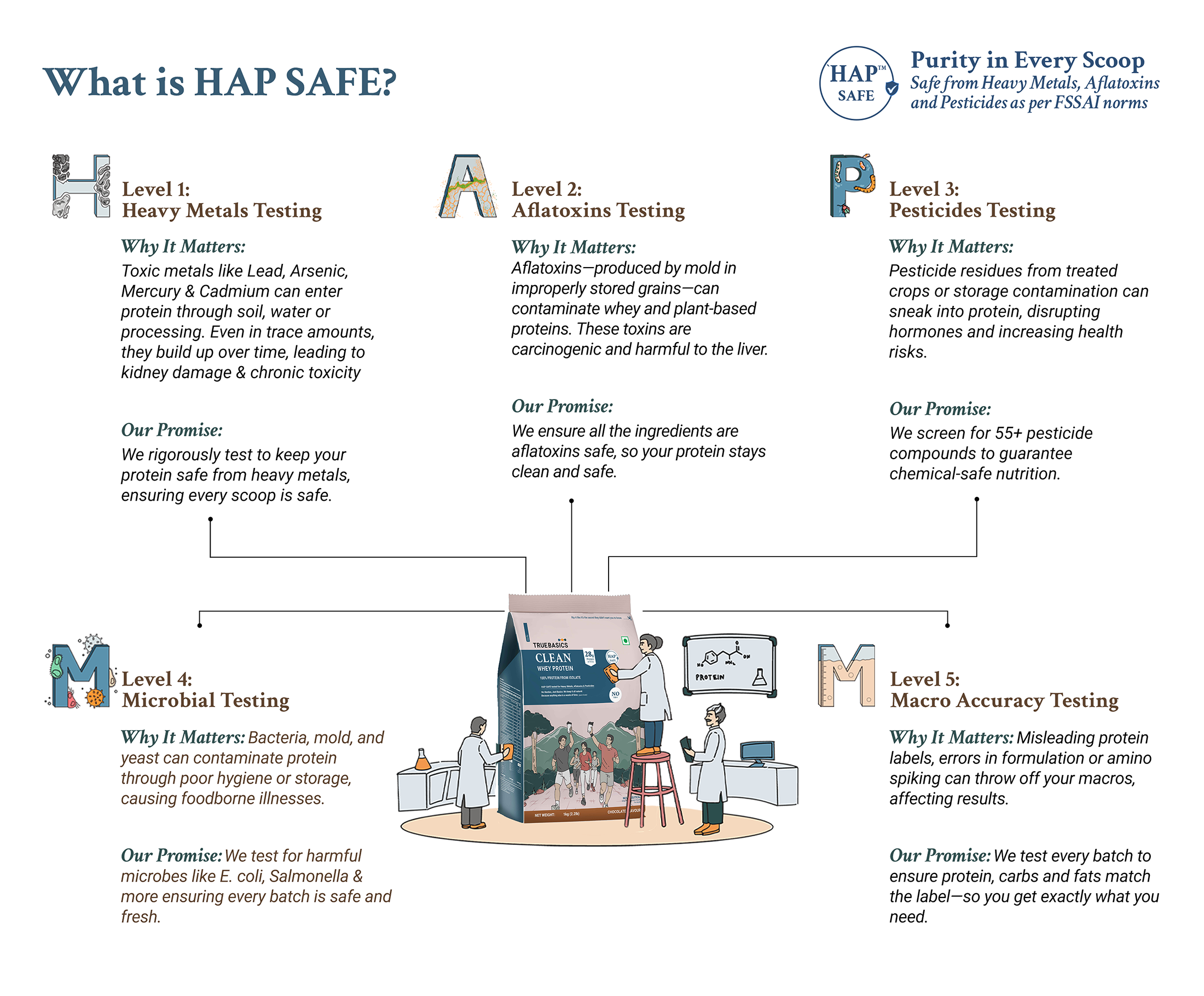 - HAP Safe Certified - Uncompromising Purity & Safety:- Every batch is tested and certified to meet the highest safety standards for heavy metals, aflatoxins, microbial load, pesticide residues, and macronutrient accuracy. No contaminants. No compromises. Just pure, high-quality protein you can trust.