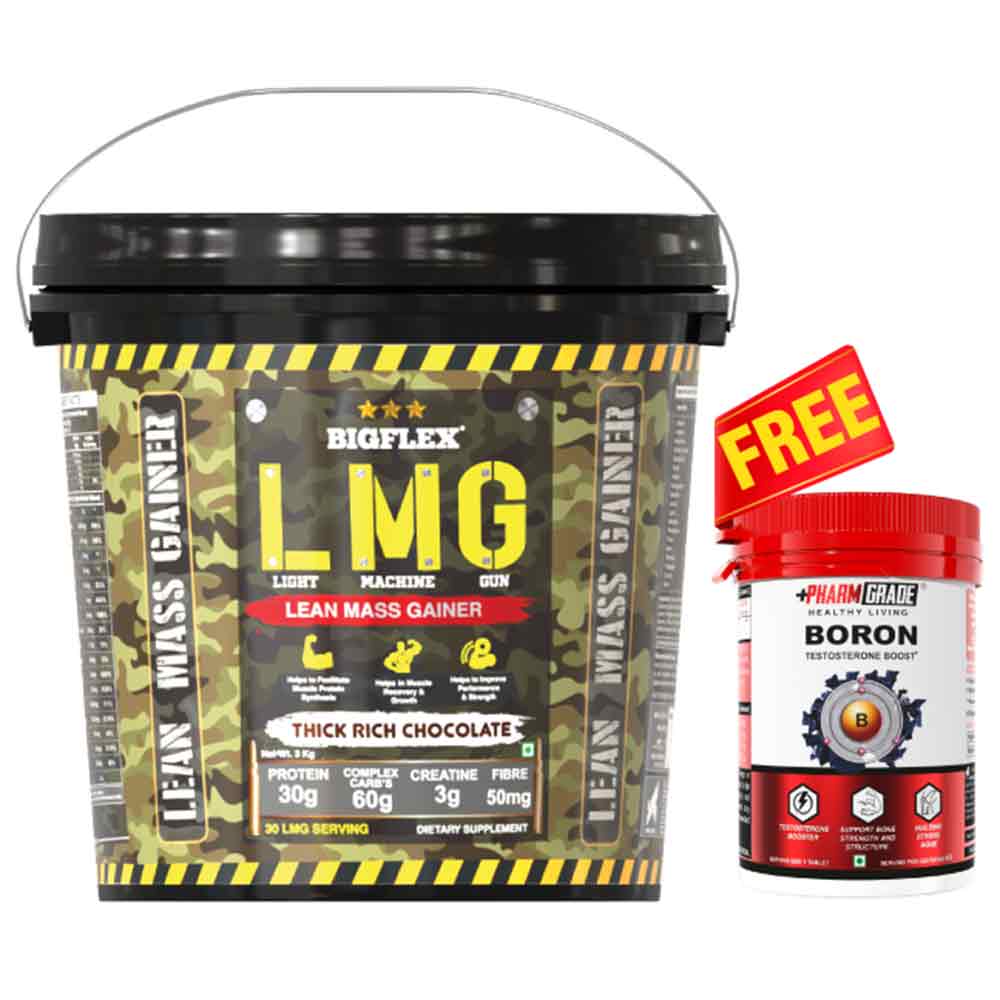 Big Flex LMG(Light Machine Gun) Lean Mass Gainer, 3 kg (6.6 lb), Thick Rich Chocolate + Pharmgrade Healthy Living Boron 60 Tabs Free