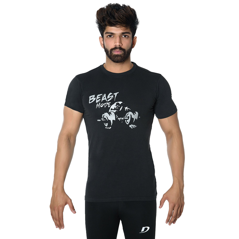 DK Active Wear Half Sleeve Gym T Shirt (Beast Mode), Black and Silver, Large