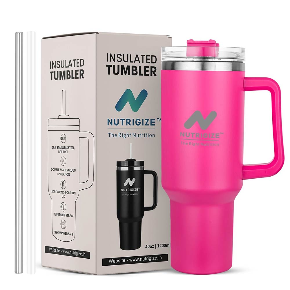 GHC Nutrigize Stainless Steel Tumbler Hot and Cold with Handle and Steel straw, 1.2 L, Dark Pink
