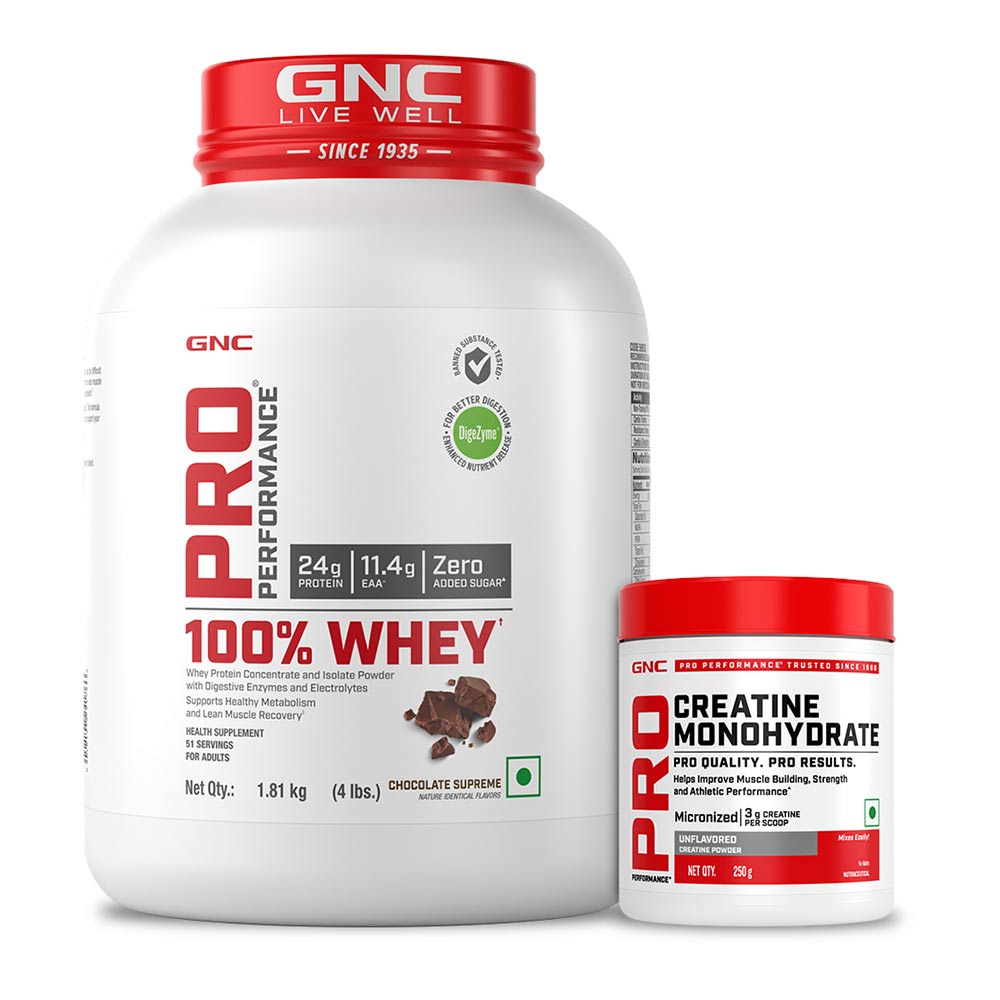 GNC Pro Performance 100% Whey 4 lb & Creatine Monohydrate 0.55 lb Combo, 2 Piece(s)/Pack, Chocolate Supreme & Unflavoured