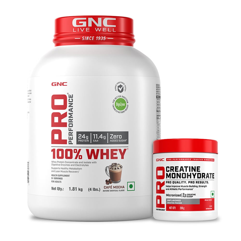 GNC Pro Performance 100% Whey 4 lb & Creatine Monohydrate 0.55 lb Combo, 2 Piece(s)/Pack, Cafe Mocha & Unflavoured