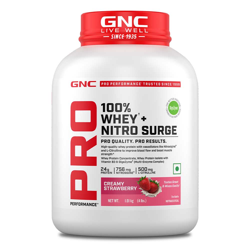 GNC Pro Performance 100% Whey + Nitro Surge, 1.82 kg (4 lb), Creamy Strawberry