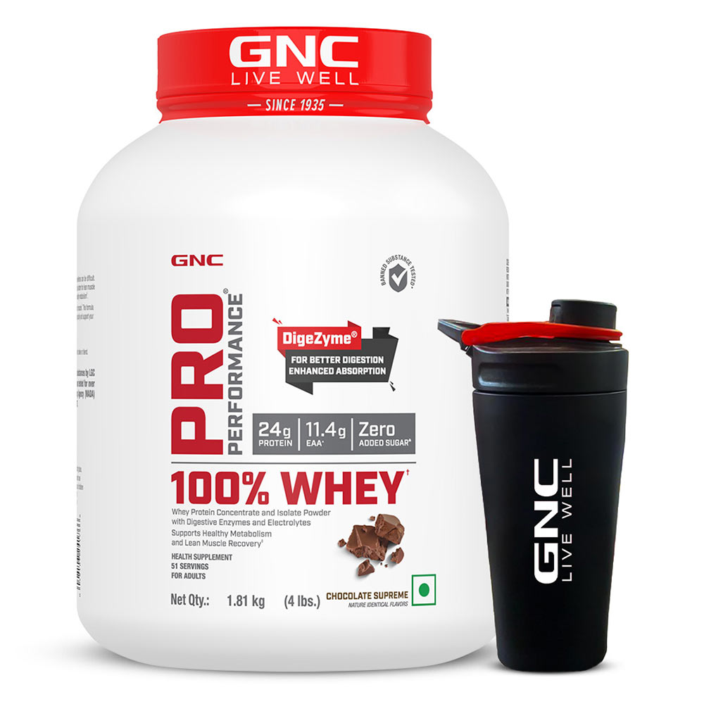 GNC Pro Performance 100% Whey Protein & Steel Shaker 700 ml Combo, 1.82 kg (4 lb), Chocolate Supreme