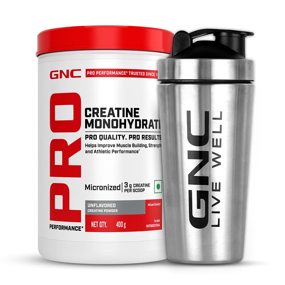 GNC Pro Performance Pure Micronized Creatine Monohydrate, 400 g (0.88 lb), Unflavoured with Steel Shaker 750ml