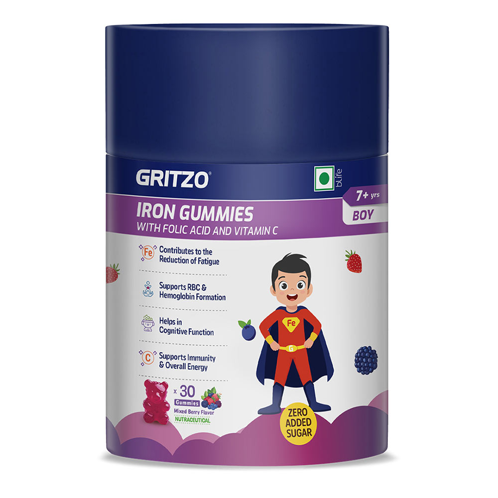 Gritzo Iron Gummies with Folic Acid and Vitamin C for 7-12 Years Boys, 30 gummies, Mixed Berry