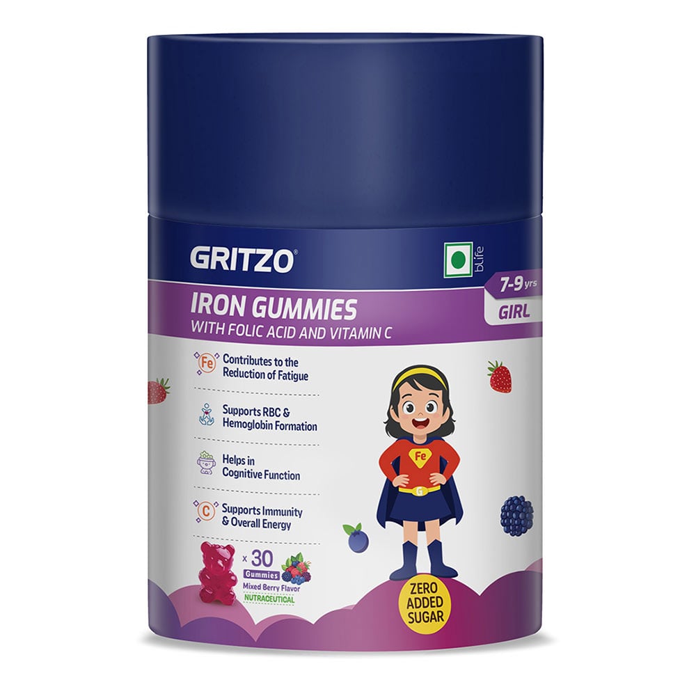 Gritzo Iron Gummies with Folic Acid and Vitamin C for 7-9 Years Girls, 30 gummies, Mixed Berry