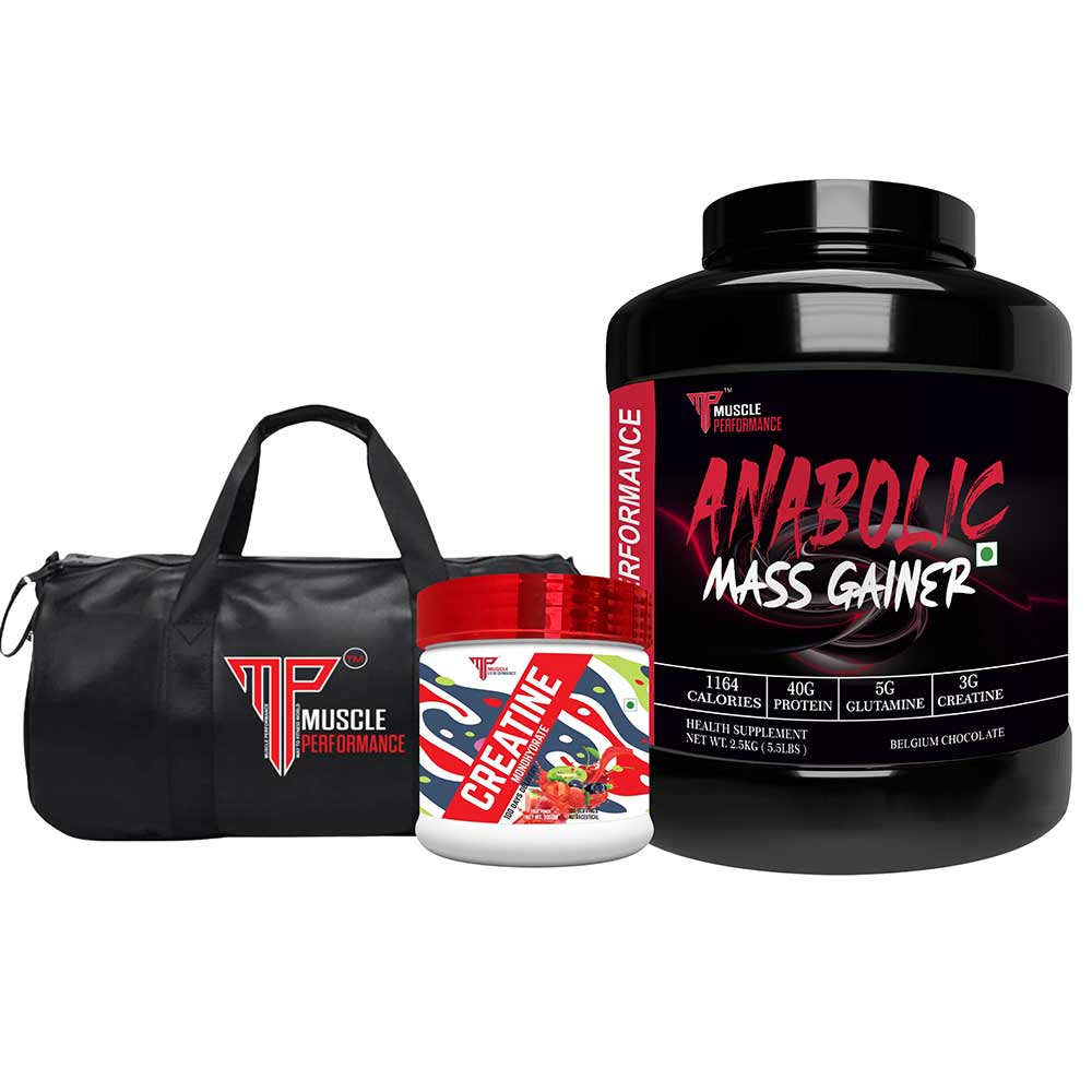 Muscle Performance Anabolic Mass Gainer with Creatine Monohydrate 0.66 lbs & Gym Bag Combo, 2.5 kg (5.5 lb), Belgium Chocolate