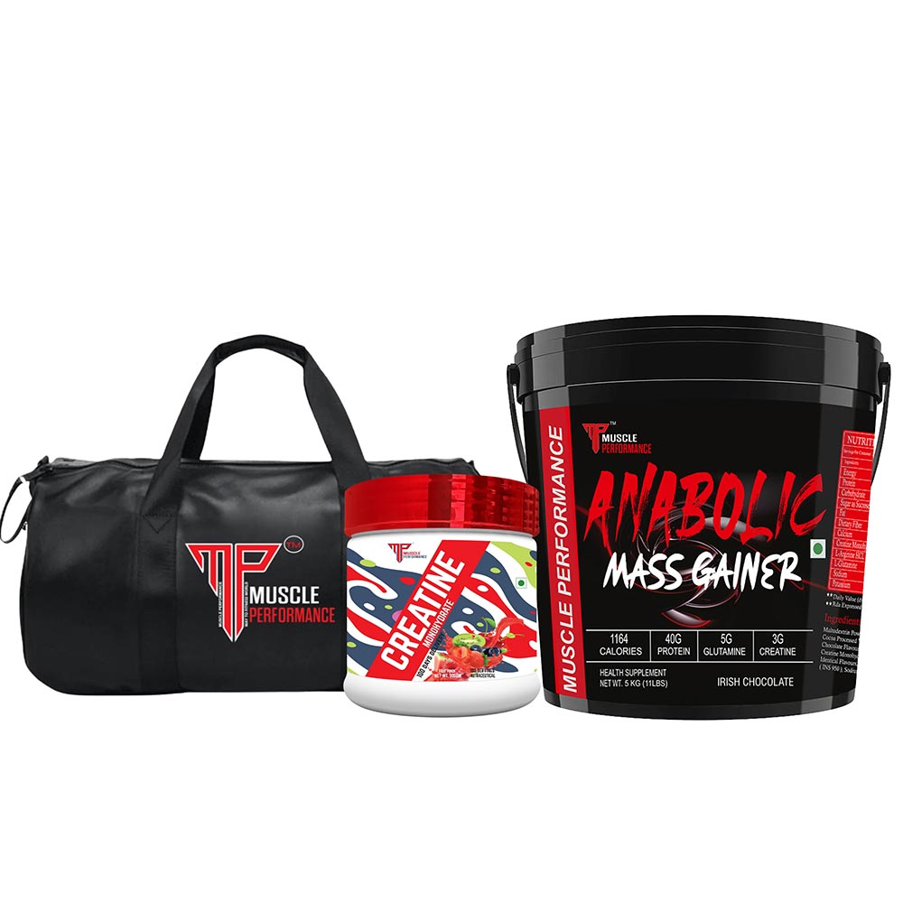 Muscle Performance Anabolic Mass Gainer with Creatine Monohydrate 0.66 lbs & Gym Bag Combo, 5 kg (11 lb), Irish Chocolate