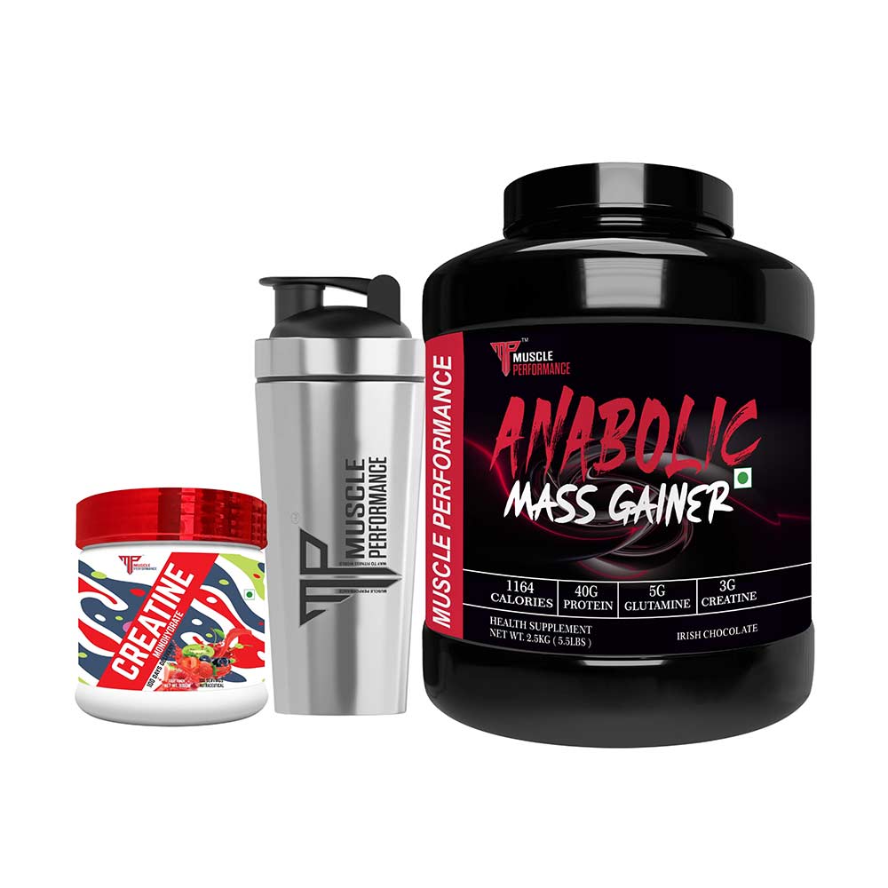 Muscle Performance Anabolic Mass Gainer with Creatine Monohydrate 0.66 lbs & Steel Shaker Combo, 2.5 kg (5.5 lb), Irish Chocolate