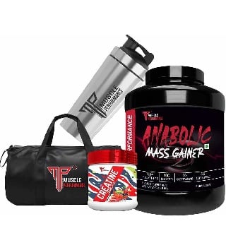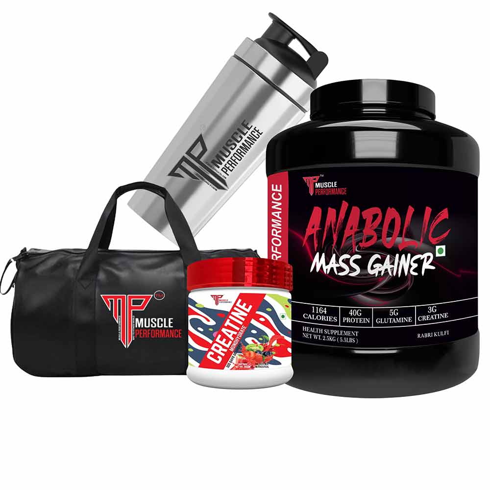 Muscle Performance Anabolic Mass Gainer with Creatine Monohydrate 0.66 lbs, Steel Shaker & Gym Bag Combo, 2.5 kg (5.5 lb), Creamy Vanilla