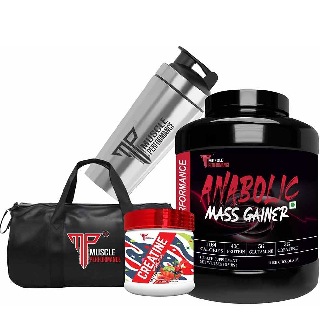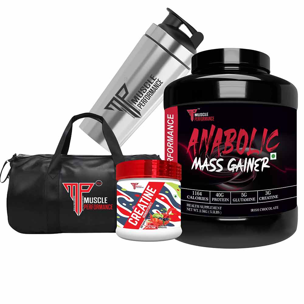Muscle Performance Anabolic Mass Gainer with Creatine Monohydrate 0.66 lbs, Steel Shaker & Gym Bag Combo, 2.5 kg (5.5 lb), Irish Chocolate