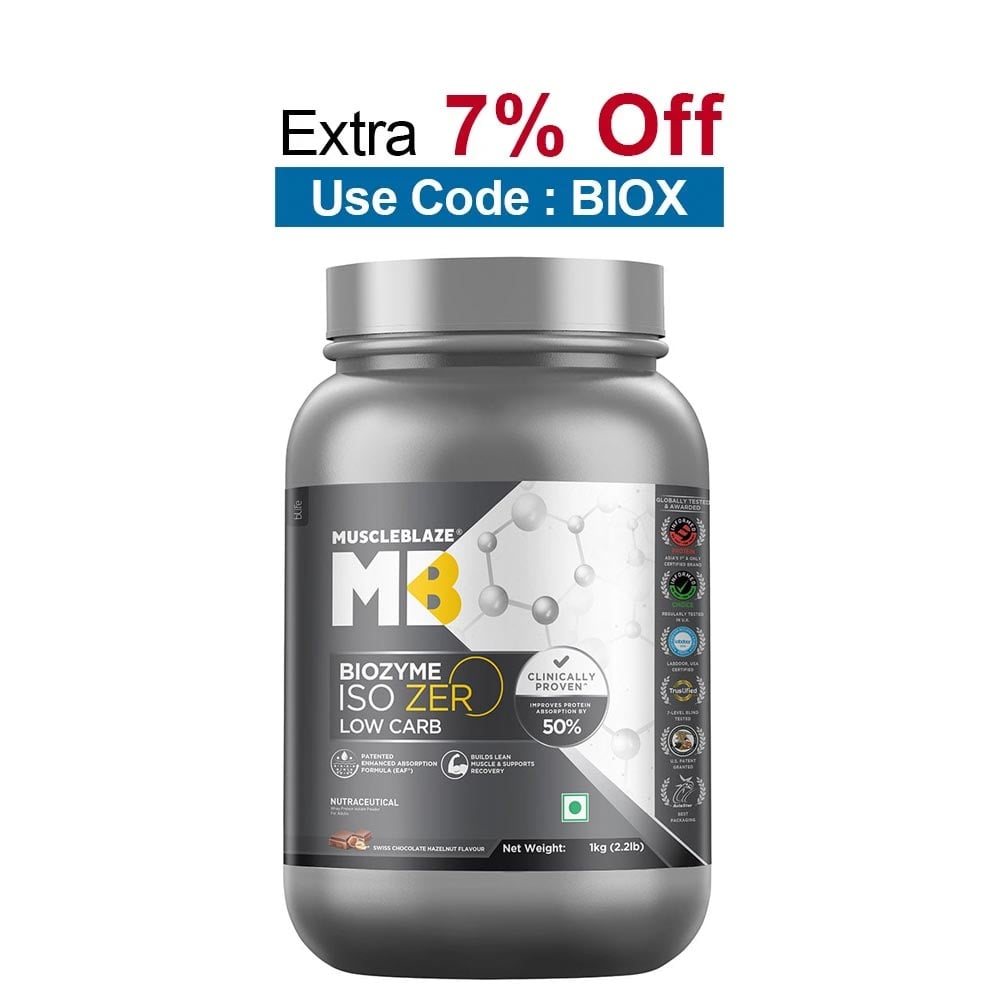MuscleBlaze Biozyme Iso-Zero, 1 kg (2.2 lb), Low Carb Swiss Chocolate Hazelnut - Low Sweetness