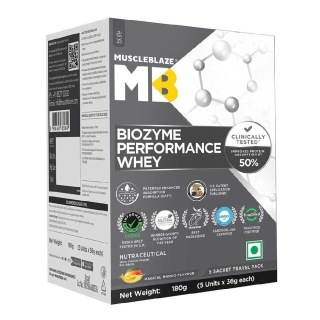 MuscleBlaze Biozyme Performance Whey Protein Powder, 180 g (0.39 lb), Magical Mango (Mono Carton)(5x36g) Travel Pack