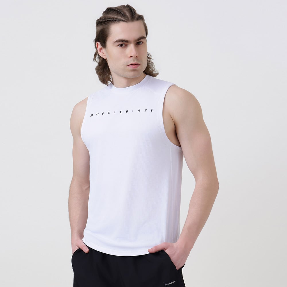 MuscleBlaze Patterned Dry-Fit Delt Tank, Polar White, Small