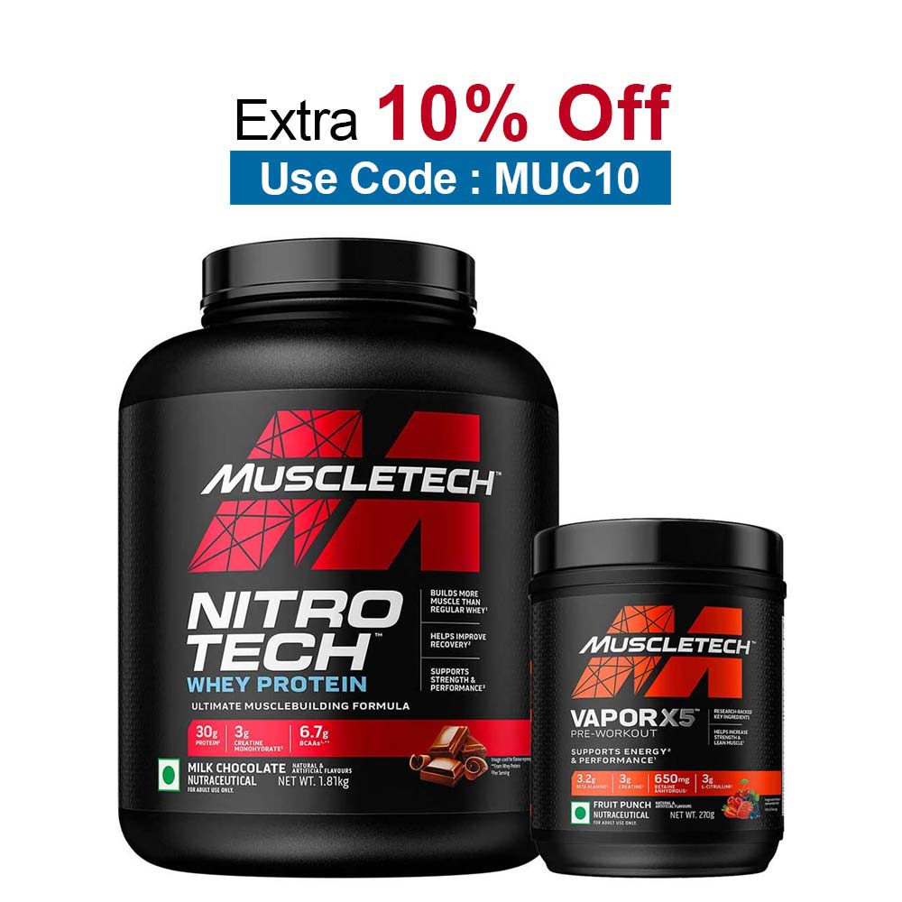 MuscleTech NitroTech Whey Protein 4 lb Milk Chocolate(India) & Vapor X5 Combo, 270 g (0.59 lb), Fruit Punch