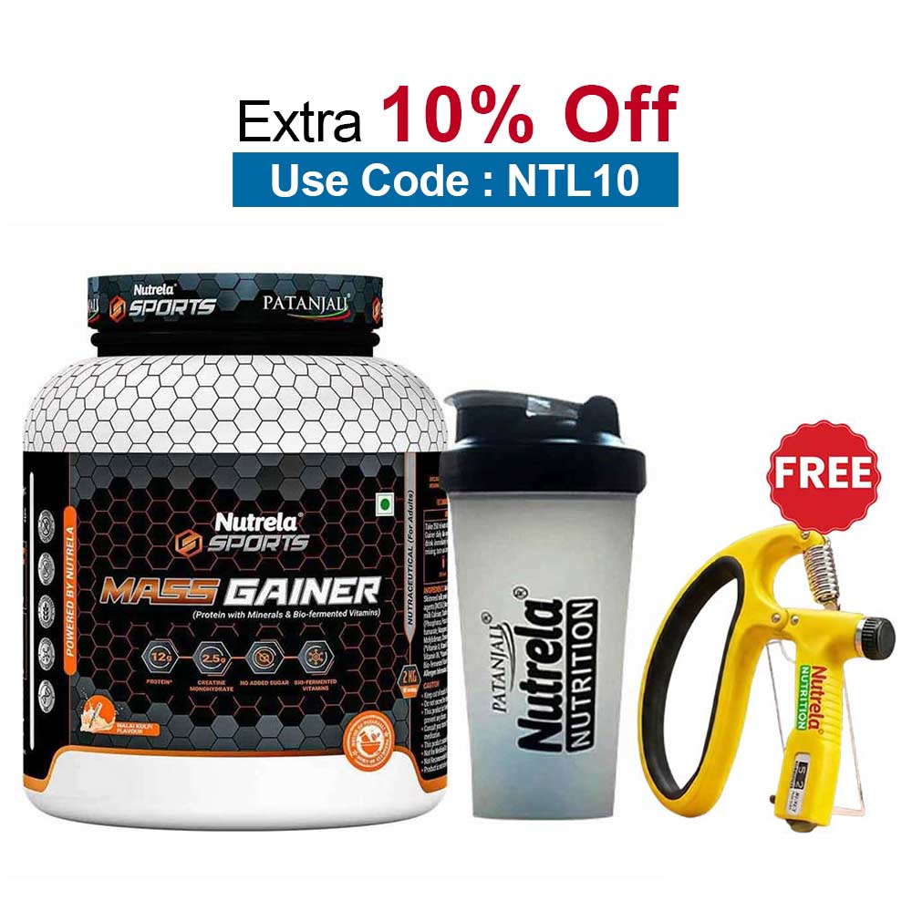 Nutrela Sports Patanjali Mass Gainer, 2 kg (4.4 lb), Malai Kulfi with Shaker