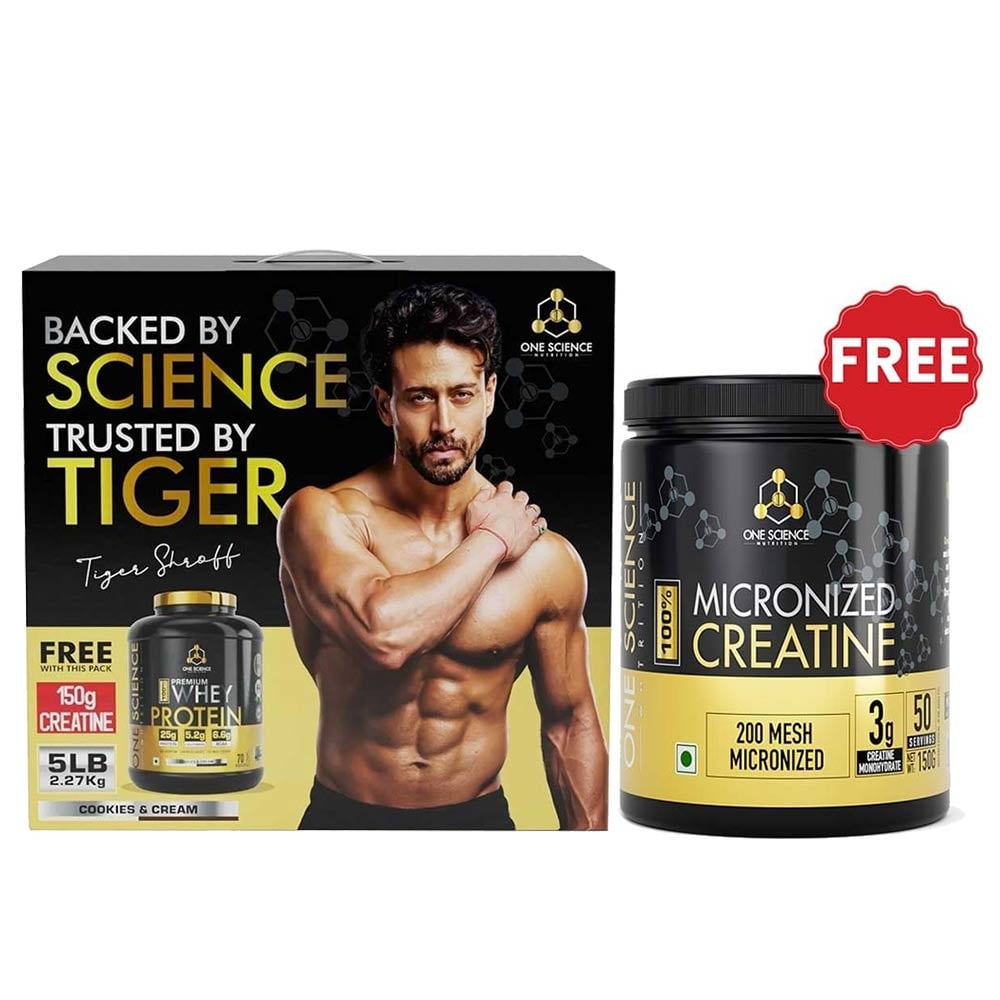 One Science 100% Premium Whey Protein, 2.27 kg (5 lb), Cookies & Cream - with Free 150g Creatine