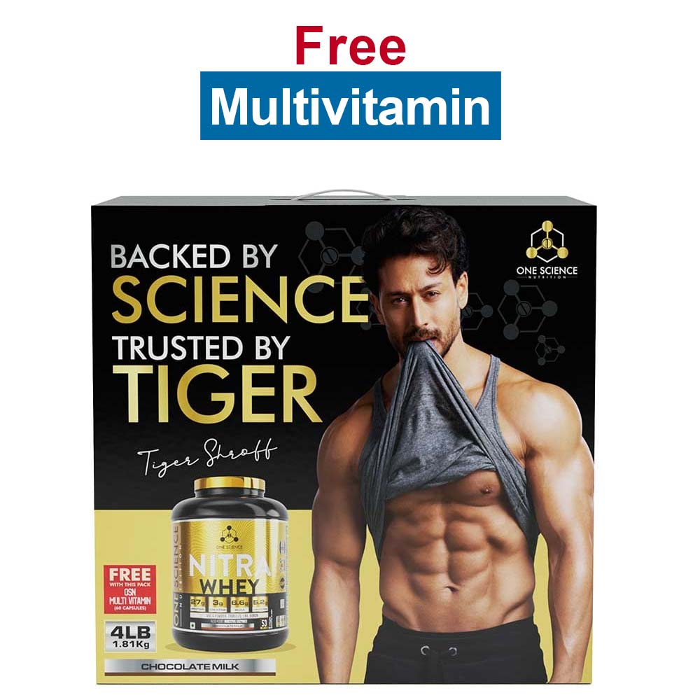 One Science Nitra Whey Tiger Combo Pack, 1.82 kg (4 lb), Chocolate Milk with Daily Multivitamin 60 Capsules