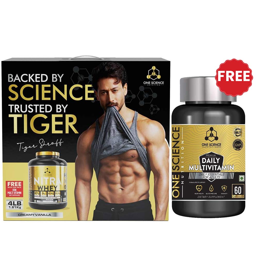 One Science Nitra Whey Tiger Combo Pack, 1.82 kg (4 lb), Creamy Vanilla with Daily Multivitamin 60 Capsules