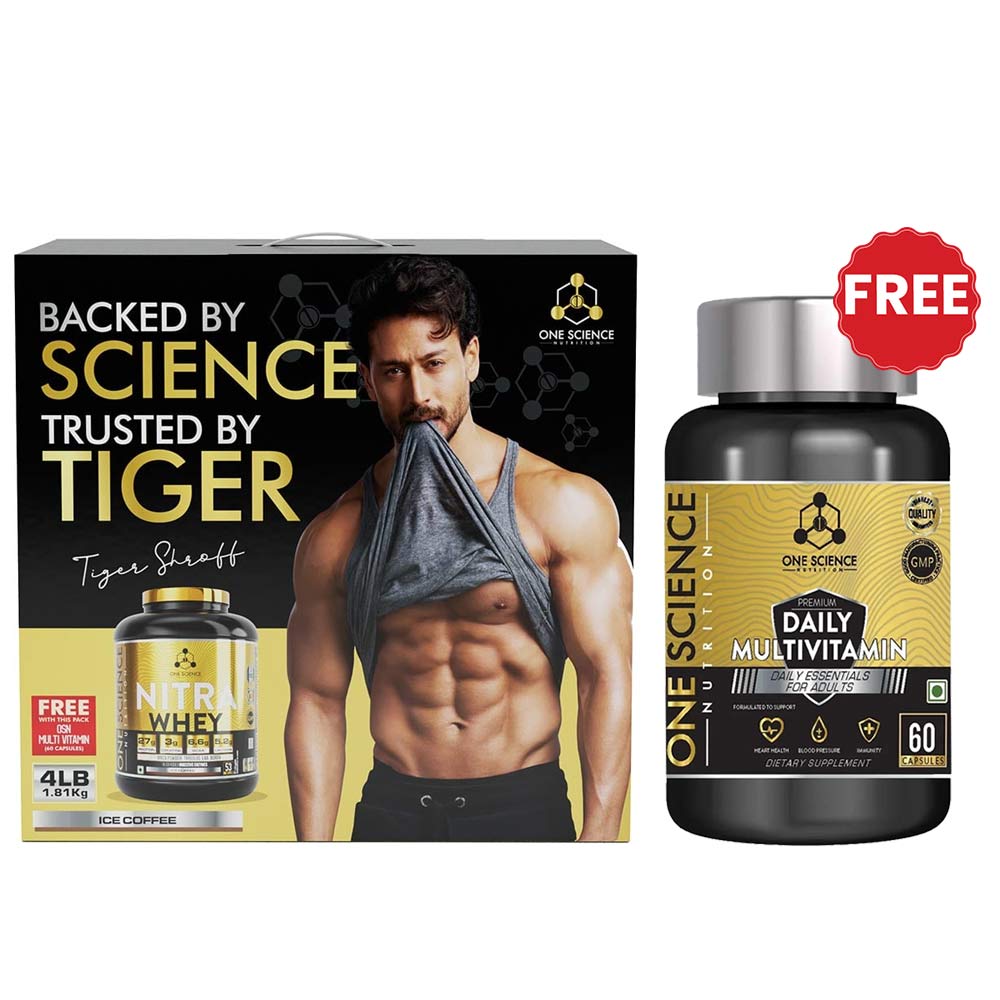 One Science Nitra Whey Tiger Combo Pack, 1.82 kg (4 lb), Ice Coffee with Daily Multivitamin 60 Capsules