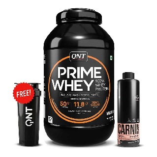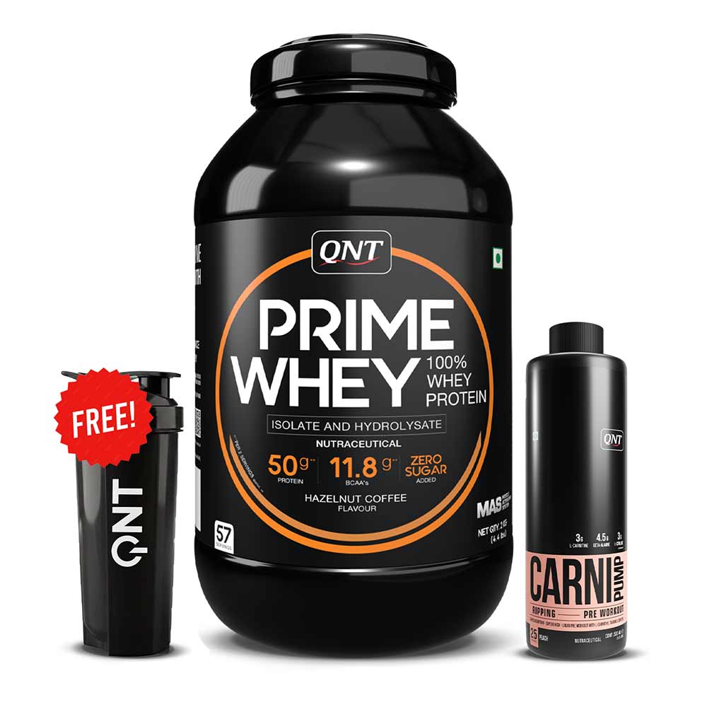 QNT Prime Whey, Carnipump Ripping Pre-workout 500 ml Peach & Plastic Protein Shaker Black 700ml Combo, 2 kg (4.4 lb), Hazelnut Coffee