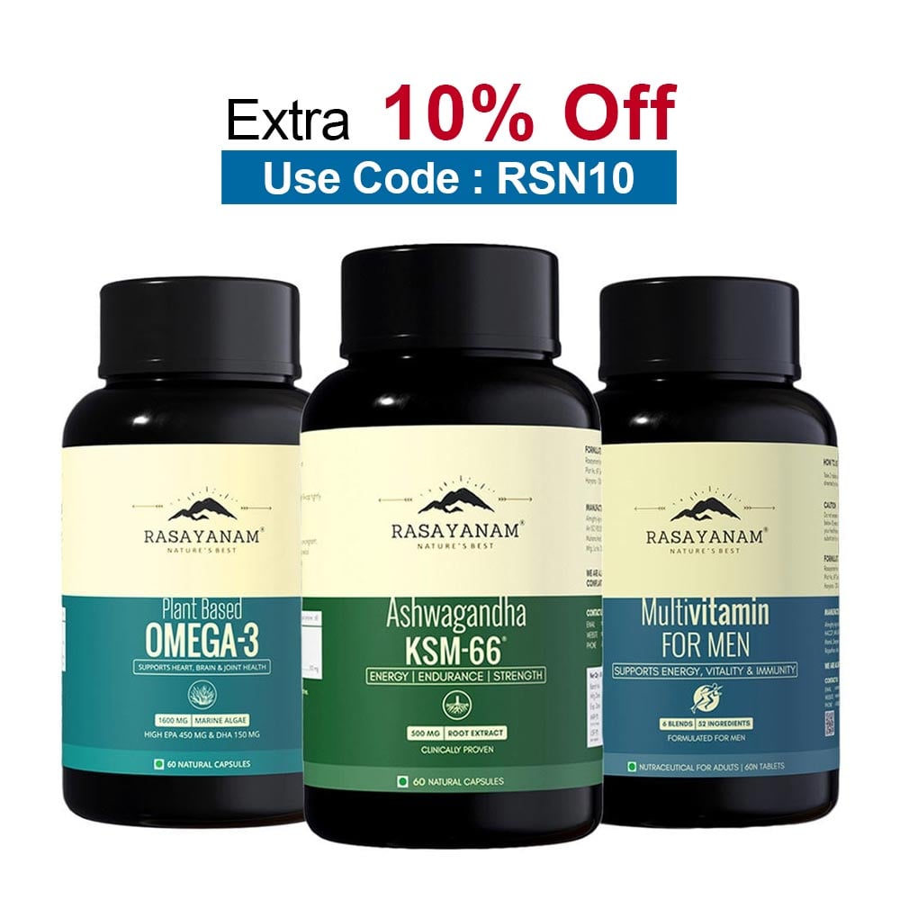 Vitamins & SupplementsOmega Fatty AcidsOmega 3Rasayanam Plant Based Omega 3 60 Caps with Ashwagandha KSM-66 60 Caps & Multivitamin for Men Combo