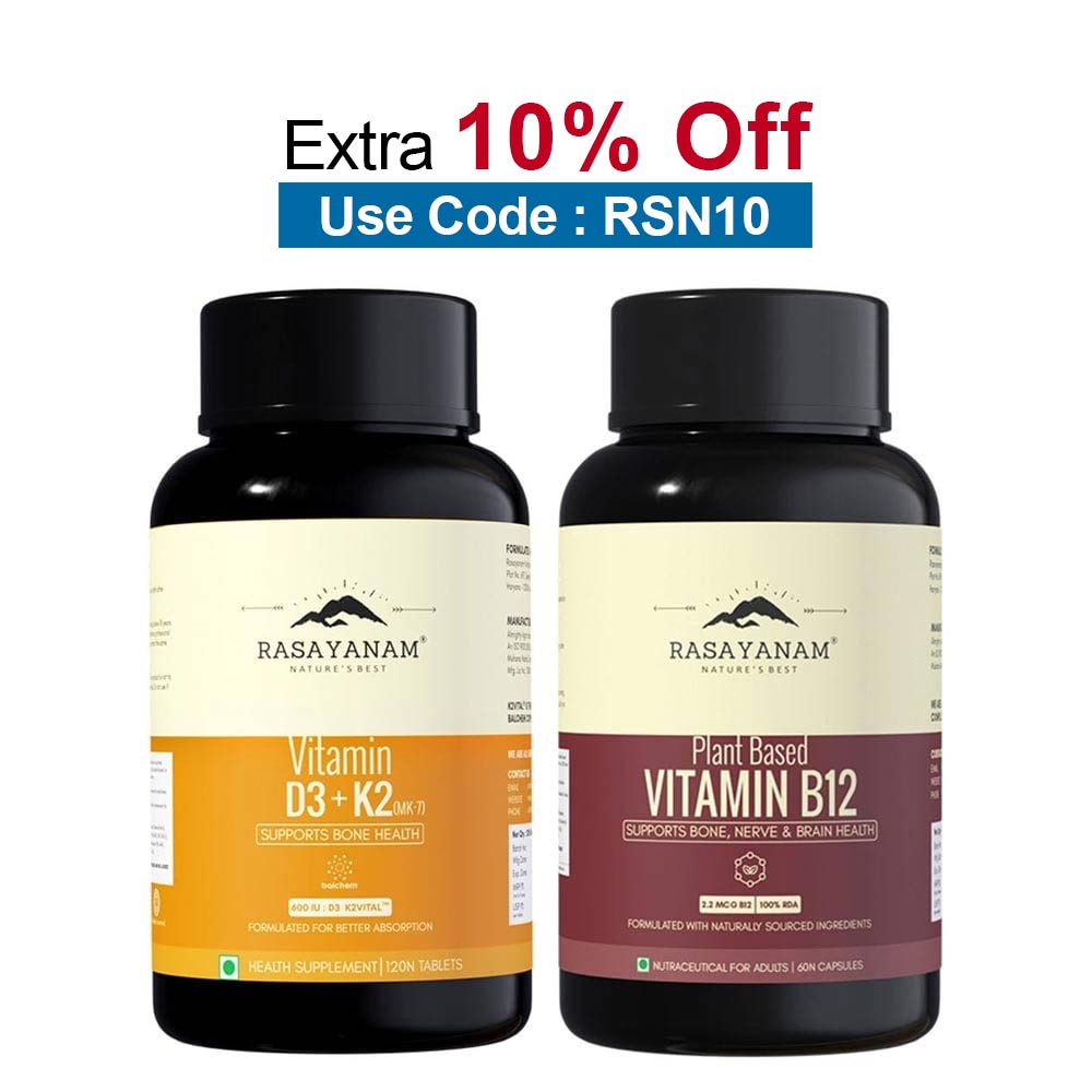 Rasayanam Vitamin D3 K2 (MK-7) 120 Tablets & Plant Based Vitamin B12 Combo, 60 capsules