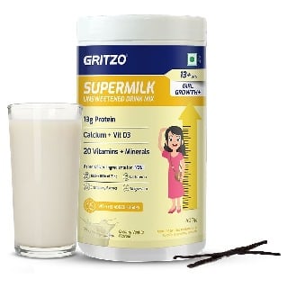 Supermilk Gritzo Growth+(Formerly Height+) Unsweetened for Girl 13+ Years, 400 g, Creamy Vanilla