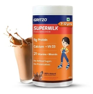 Supermilk Gritzo Overall Growth for Boy 7-12 Yrs Protein & Nutrition Drink Mix OP, 400 g, Natural Double Chocolate