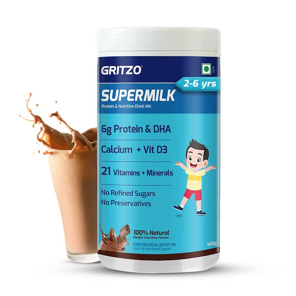Supermilk Gritzo Overall Growth for Boy/Girl 2-6 Yrs Protein & Nutrition Drink Mix OP, 400 g, Double Chocolate