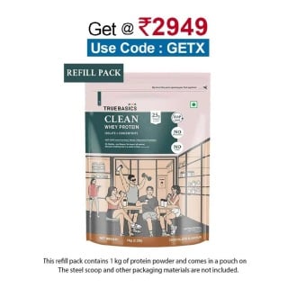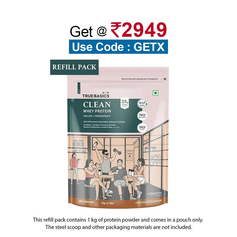 TrueBasics Clean Whey Protein (Isolate + Concentrate), 1 kg (2.2 lb), Chocolate (Refill Pack)